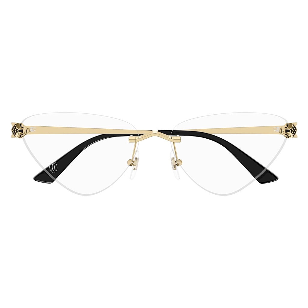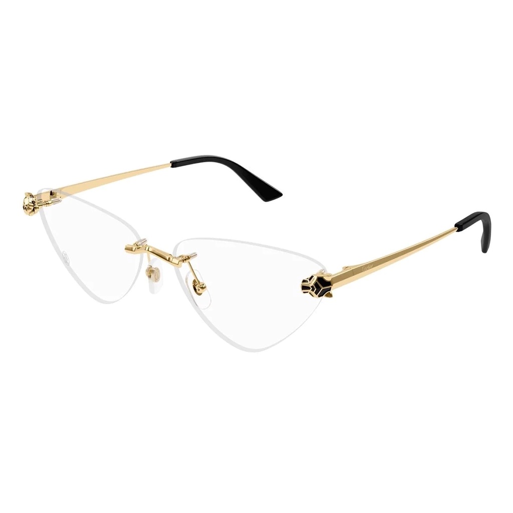 The CT0448O 001 features a contemporary cat-eye shape with a Panthère head detail for a sophisticated look. It includes geometric lines, black enamel, gold and platinum finishes, and comfortable acetate temple tips.