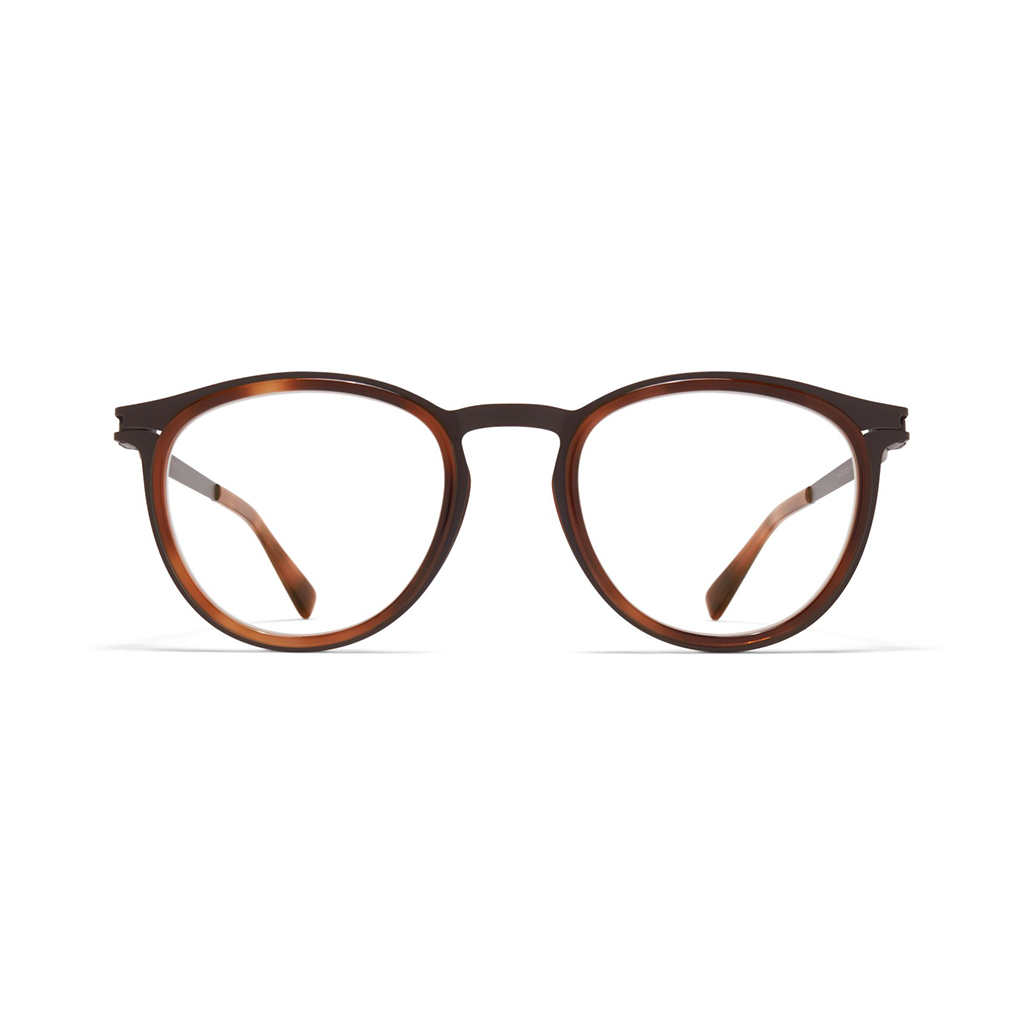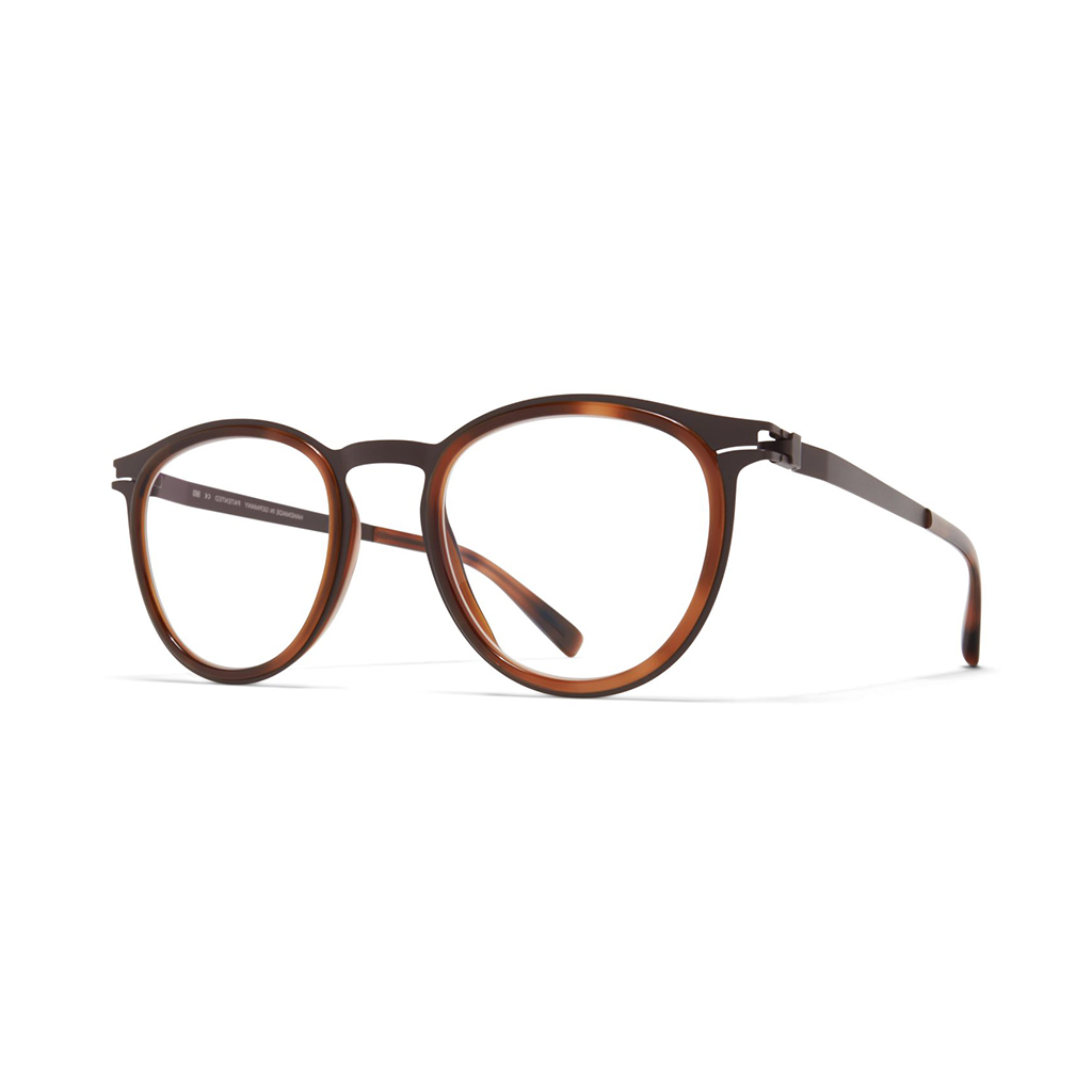 Made of lightweight stainless steel Siwa in dark brown/zanzibar with clear lenses is a panto-shaped optical frame from the Mykita acetate rings collection. Handcrafted in Berlin.