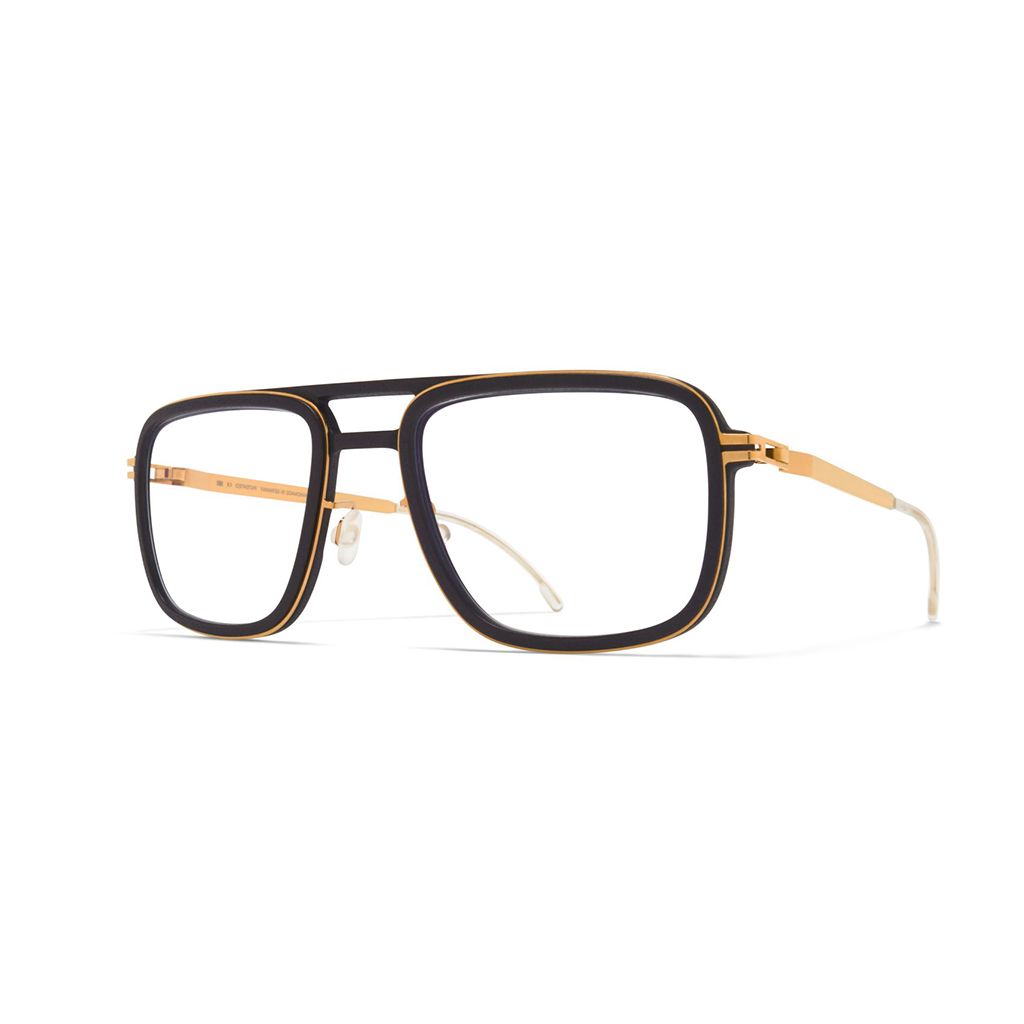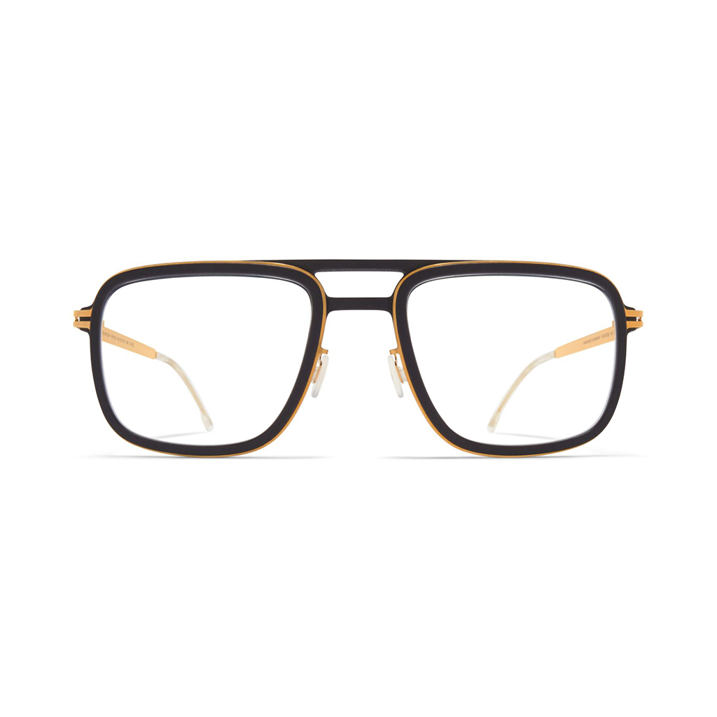 Made of lightweight stainless steel with details in Mylon Spruce in pitch black/glossy gold with clear lenses is a square-shaped sunglass frame from the Mykita Mylon collection. Handcrafted in Berlin.